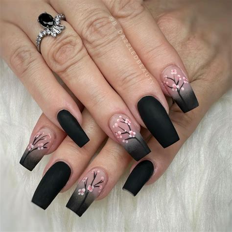 Infuse your dark matte nails with a touch of femininity with delicate florals. Use a nail art brush or stencils to paint intricate petals and stems in contrasting shades or opt for a subtle ombré effect for a more ethereal look.